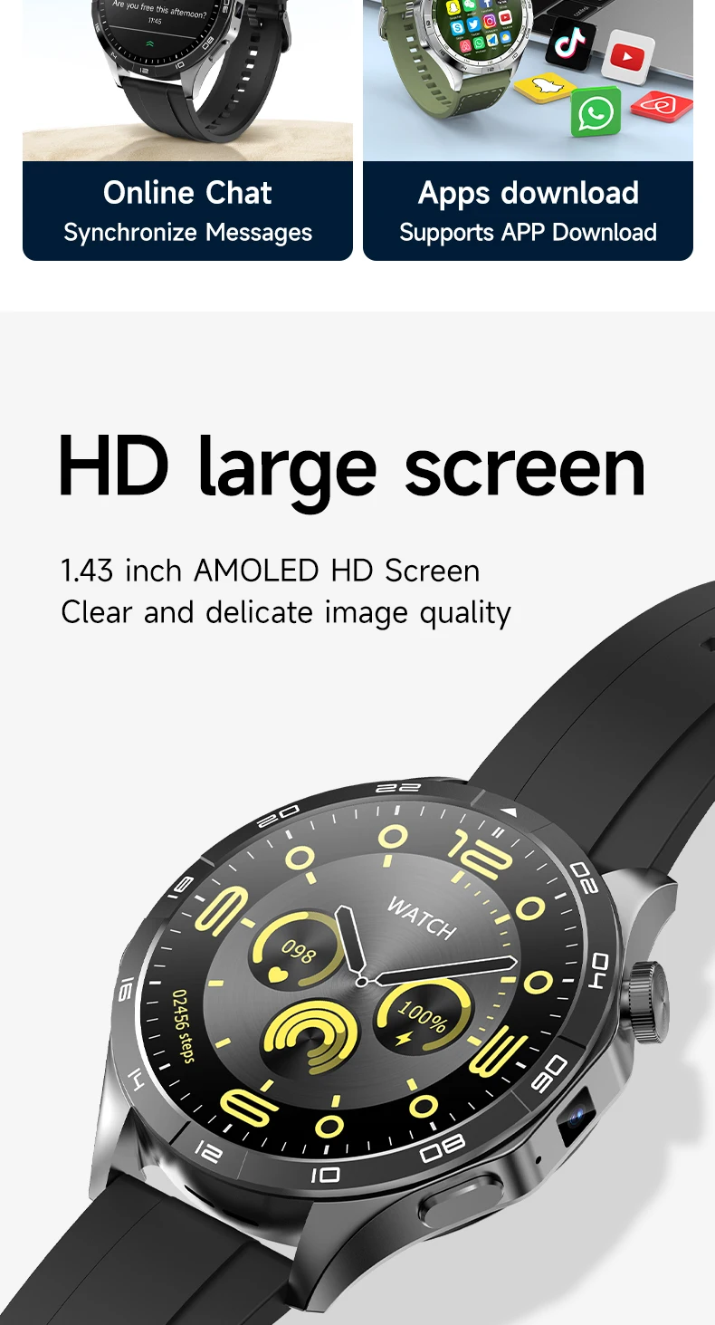 4. 1.43 inch large Amoled screen with a resolution of 466*466, 200W HD Pull and rotate camera;