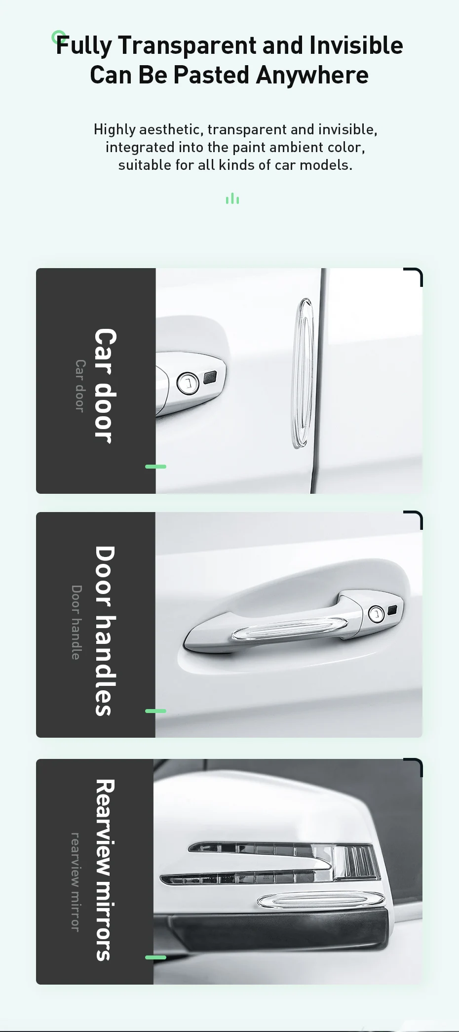 Highly aesthetic, transparent, and invisible, integrated into the paint ambient color, suitable for all kinds of car models.