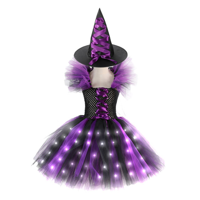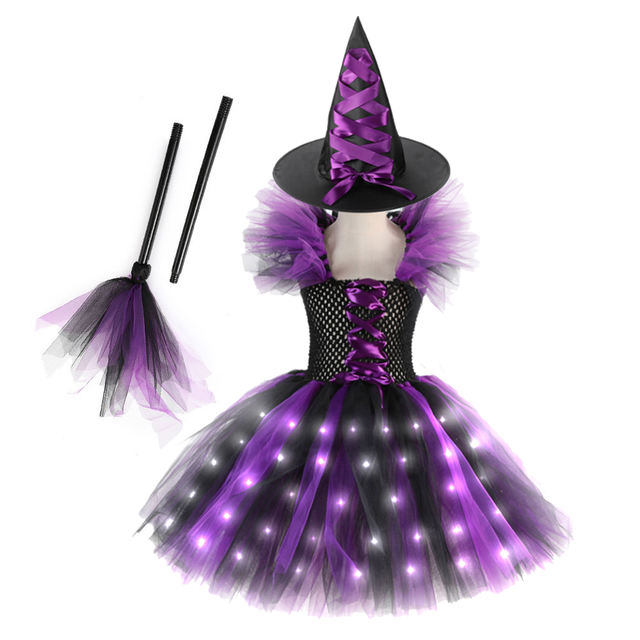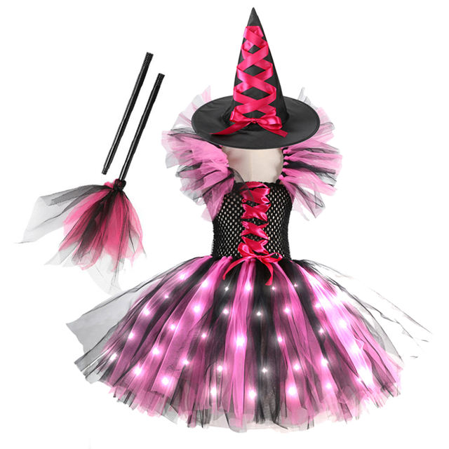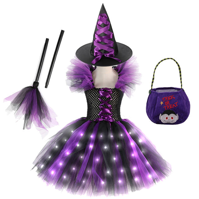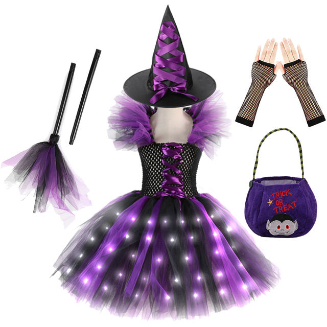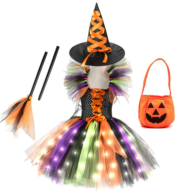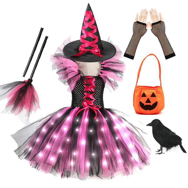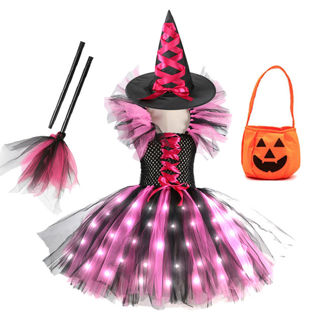 Halloween Cosplay Witch LED Luminous Costume for Baby Girl Children Carnival Party Gown Kids Witch Lights Up Dress Clothing Set