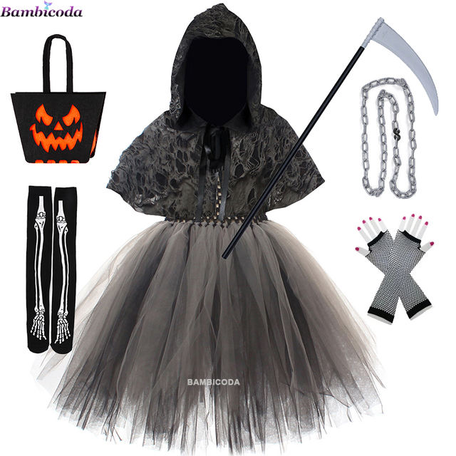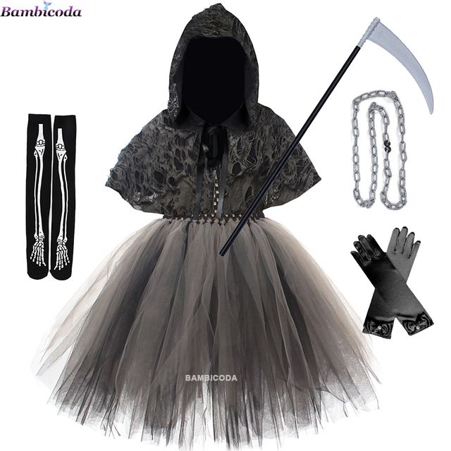 Halloween Party Cosplay Children Girls Death Black Cloak Halloween Skull Skeleton Ball Costume Prop Set Death Cosplay Costume