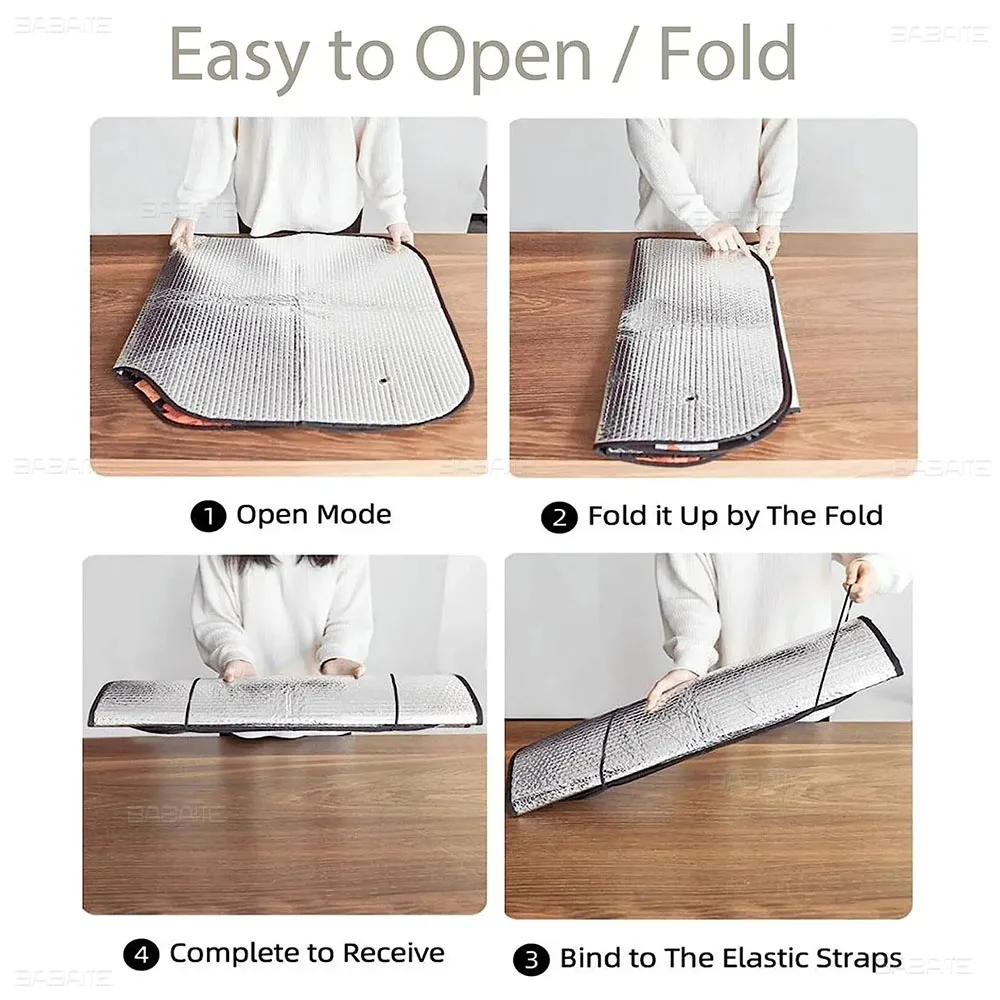 MATERIAL:The front window sun shade use 100% polyester and Reflective aluminum foil with thicken layer bubble make the cooling effect is more significant. Heat resistant, Lightweight and portable.