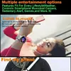 AI Voice, Bluetooth Answer Call, Bluetooth Dial Call, Contact person, Call records, Messages Reminder, Alarm clock, Timer, Weather, Music remote, Camera remote, Find phone, Calculator, Flashlight. Dynamic watch face, watch face market (400+ watch faces), custom watch faces(you can set the picture you like as the watch face), Set the screen off time, Do not disturb mode. Built-in 3 User Interface.