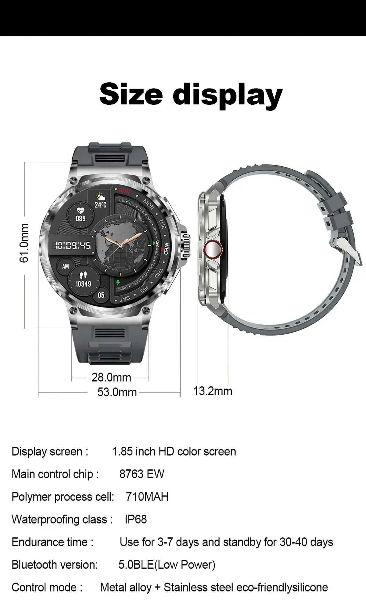 V69 smart watch is designed for strong individuals, the watch diameter is 52mm, using high-quality military-grade zinc alloy materials.